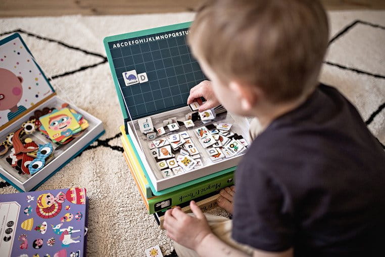 Magnetyczna układanka Magnetibook francuskiej marki JANOD to doskonała zabawka, rozwijająca kreatywność i wyobraźnię. Zabawa polega na układaniu na planszy magnesów, które dziecko może dowolnie łączyć we wzory.