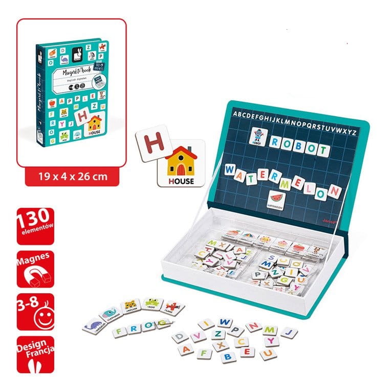 Magnetibook Alfabet zawiera 104 magnesy z literami alfabetu w angielskiej wersji i 26 magnesy z kolorowymi obrazkami i słowami, które je opisują.
