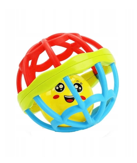 Niebieska i czerwona część jest gumowa, dzięki temu dziecko może ją delikatnie zgniatać. Uśmiechnięta buźka w środku piłeczki jest grzechotką.