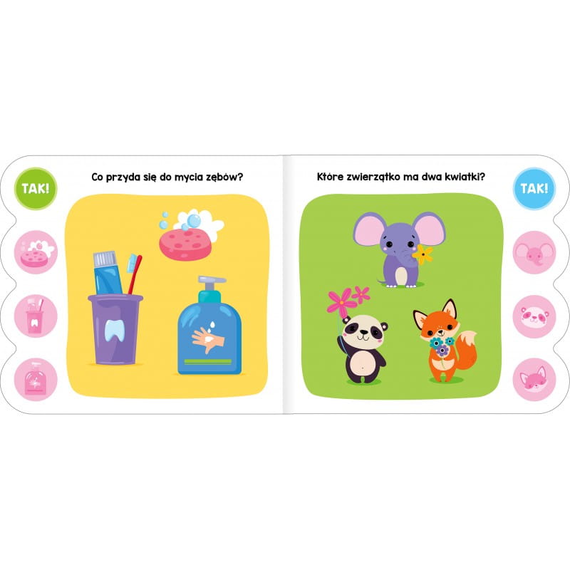 Maluch przykleja okrągłe naklejki w wyznaczonych polach i wśród nich wskazuje odpowiedź na zadane pytanie. Ten sam kolor znaczka TAK! i naklejki wskazuje poprawną odpowiedź.