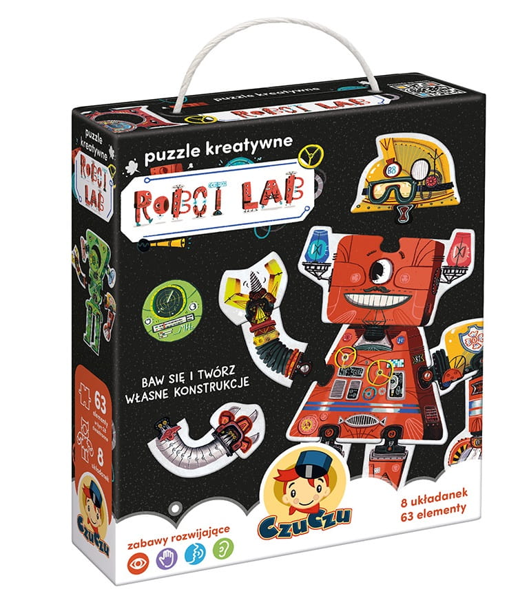 Puzzle kreatywne Robot Lab pozwalają na mnóstwo twórczej i rozwijającej zabawy. To nie tylko doskonały sposób, by rozwijać małą motorykę, spostrzegawczość i wyobraźnię, ale także zainteresować dzieci w wieku przedszkolnym techniką i wynalazkami.