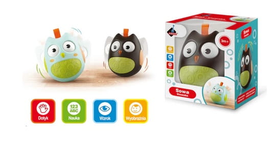 Sowa pomaga w rozwoju koordynacji ruchowej oraz zmysłów wzroku, dotyku i słuchu.