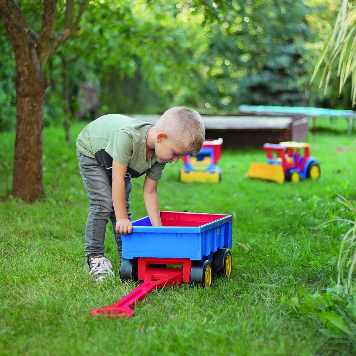 Wózek – Przyczepa z serii Gigant może służyć jako przyczepa do Gigant Traktor - Spychacz oraz Gigant Truck - Wywrotka, może być także wykorzystywany jako samodzielny wózek do ciągnięcia dzięki dołączonej do zestawu rączce. Otwierana klapa przyczepy oraz nośność do 60 kg daje wiele możliwości atrakcyjnej zabawy.Wózek wykonany z najwyższej jakości tworzywa jest wytrzymały i odporny na każdą pogodę.