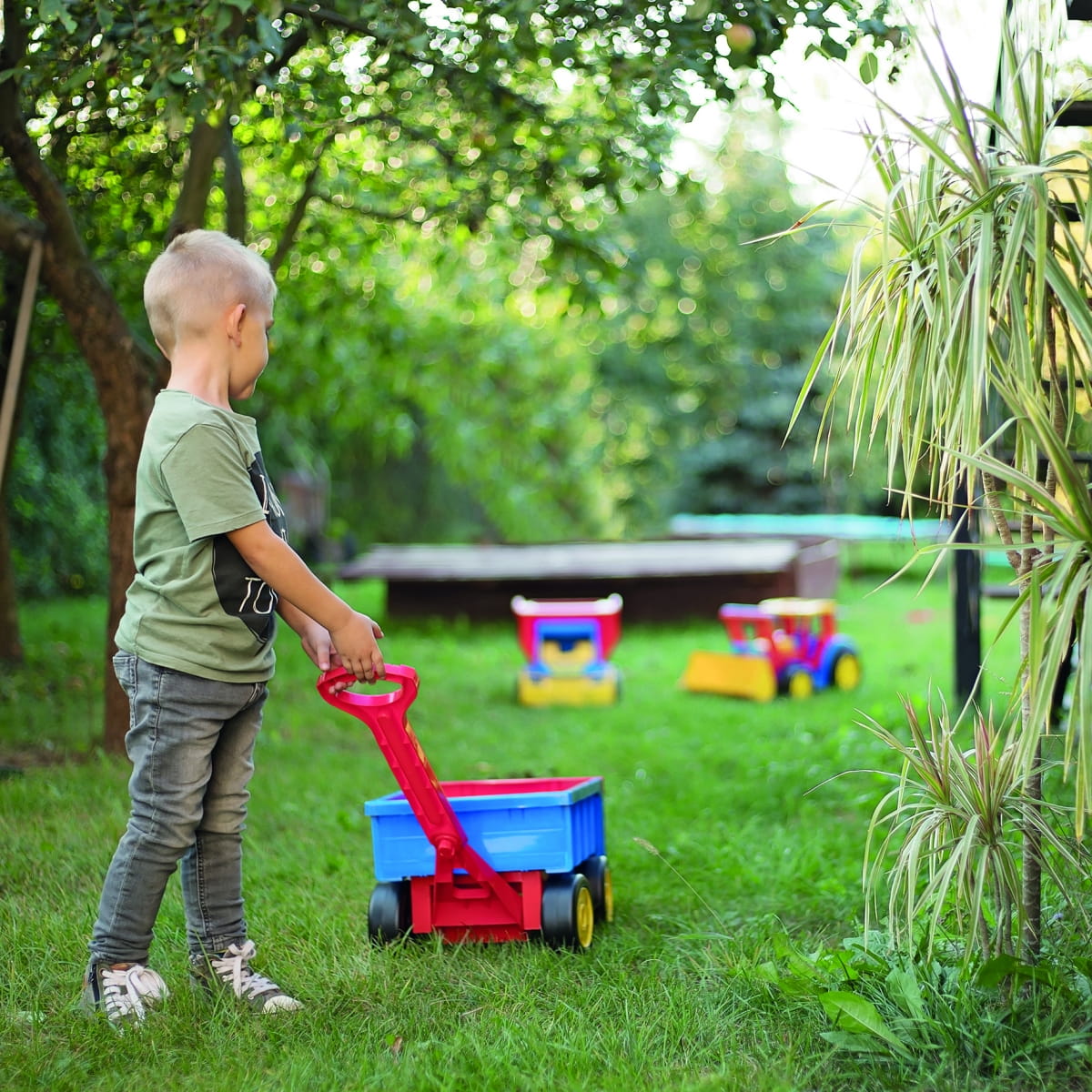 Dzieci uwielbiają przewozić w nim swoje zabawki, piasek, liście. Wózek daje również możliwość zaangażowania najmłodszych do pomocy w pracach domowych – od przewożenia prania, po prace w ogródku.