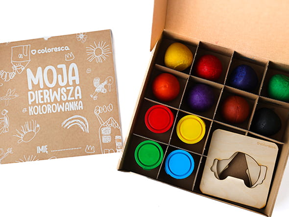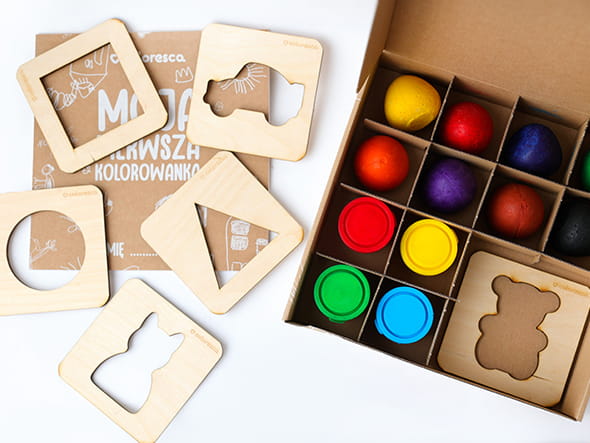 - zestaw składa się z kredek, farbek, kolorowanek i szablonów.