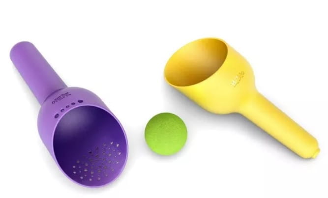 Zabawka składa się aż z trzech różnych elementów: łopatki, sitka oraz piłki. Wyjątkowe i ergonomiczne kształty pozwalają połączyć zestaw w jedno, dzięki czemu całość zajmuje niewiele miejsca – zmieści się nawet w zwykłym plecaku!