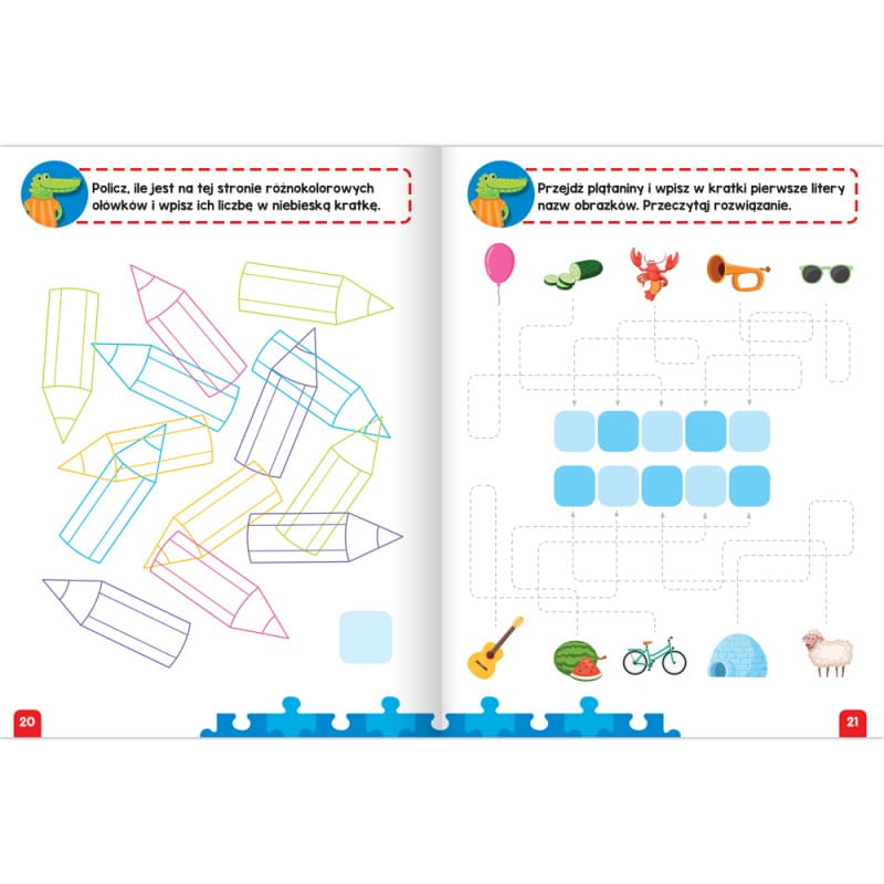 Rozwiązując je, przedszkolak dobrze się bawi, a jednocześnie utrwala znajomość liczb i liter, ćwiczy spostrzegawczość i logiczne myślenie.